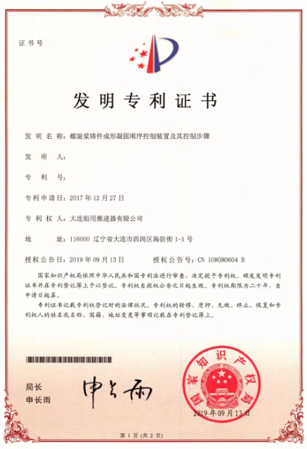 ????近日,大連船推申請(qǐng)的《螺旋槳鑄件成形凝固順序控制裝置及其控制步驟》發(fā)明專利通過國家知識(shí)產(chǎn)權(quán)局審查,獲得國家發(fā)明專利授權(quán)。