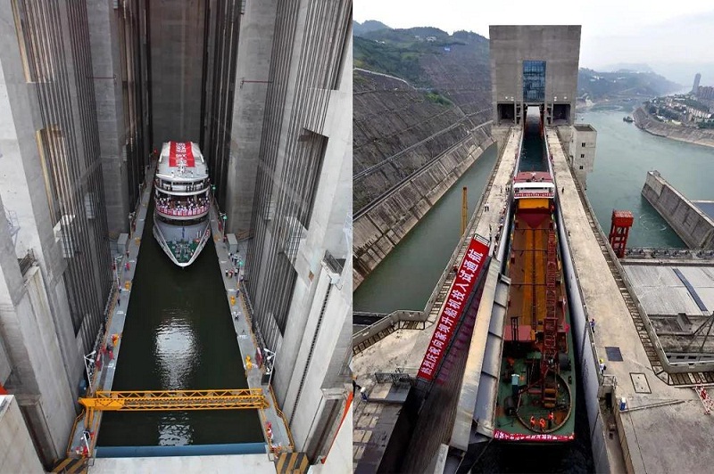 三峽升船機(左)是目前世界上技術(shù)難度和規(guī)模最大的升船機,向家壩升船機(右)是目前世界上已投入運行中提升高度最大的升船機
