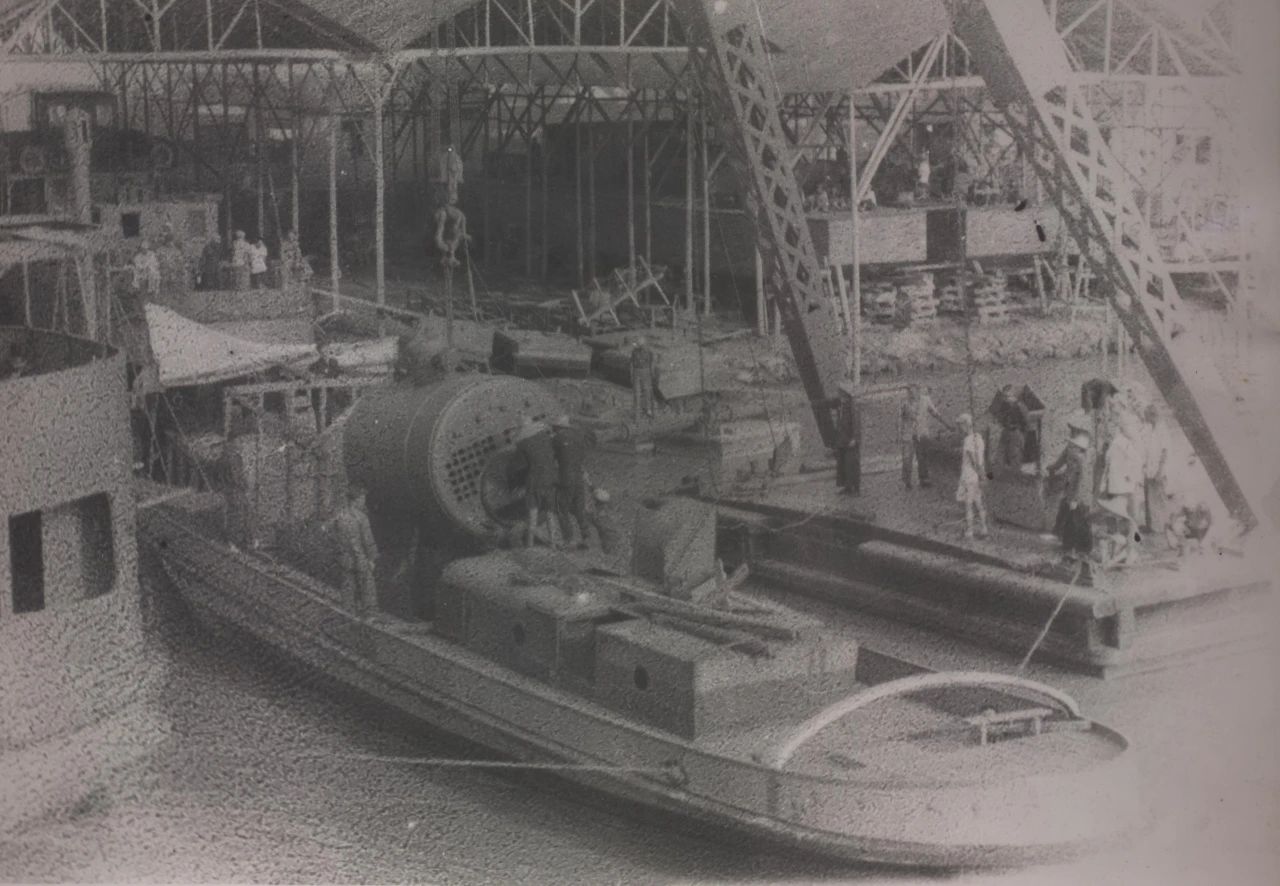 1934年武漢,上世紀30年代,武昌造船成立之初,工人們以手工作業(yè)“敲敲打打”形式開展修造船業(yè)務(wù)。修造的船只大多為100~300噸、鋼肋骨與木殼結(jié)構(gòu),僅有少量是鋼鉚接船體。建造的船只只能在長江上航行跑跑運輸。為了生存和救國,船廠還建造一些農(nóng)用機械器具、槍支,以輔助民生、支援抗日。