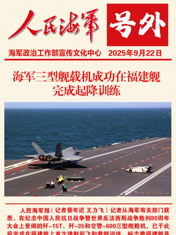記者從海軍有關(guān)部門獲悉,在紀(jì)念中國人民抗日戰(zhàn)爭暨世界反法西斯戰(zhàn)爭勝利80周年大會(huì)上受閱的殲-15T、殲-35和空警-600三型艦載機(jī),已于此前完成在福建艦上首次彈射起飛和著艦訓(xùn)練,標(biāo)志著福建艦具備了電磁彈射和回收能力。這是我國航母發(fā)展歷程中取得的又一次突破,對推進(jìn)海軍轉(zhuǎn)型建設(shè)具有里程碑意義。