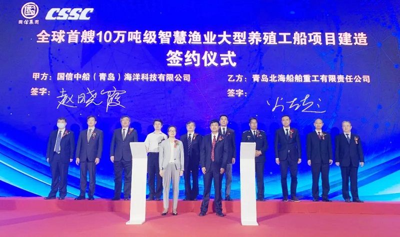 ????6月3日,中國船舶集團有限公司旗下武船集團青島北海船舶重工有限責(zé)任公司與國信中船(青島)海洋科技有限公司在青島西海新區(qū)正式簽署全球首艘10萬噸級智慧漁業(yè)大型養(yǎng)殖工船的建造合同。本次簽約標志著養(yǎng)殖工船項目正式進入實質(zhì)性建造階段,該船將于2022年3月交付。中國船舶集團黨組成員、副總經(jīng)理孫偉,青島市副市長耿濤等領(lǐng)導(dǎo)和嘉賓出席簽約儀式。