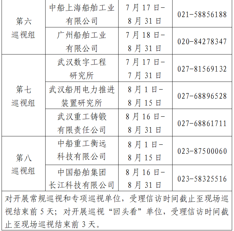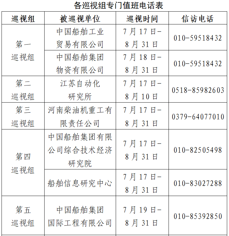 根據(jù)中國(guó)船舶集團(tuán)黨組2023年第一輪巡視工作部署,截至2023年7月17日,巡視工作已經(jīng)鋪開。其中,對(duì)中國(guó)船舶工業(yè)貿(mào)易有限公司、中國(guó)船舶集團(tuán)物資有限公司、江蘇自動(dòng)化研究所、河南柴油機(jī)重工有限責(zé)任公司、中國(guó)船舶集團(tuán)有限公司綜合技術(shù)經(jīng)濟(jì)研究院、船舶信息研究中心、中國(guó)船舶集團(tuán)國(guó)際工程有限公司等7家單位開展常規(guī)巡視,對(duì)中船上海船舶工業(yè)有限公司、廣州船舶工業(yè)有限公司等2家單位開展專項(xiàng)巡視,對(duì)武漢數(shù)字工程研究所、武漢船用電力推進(jìn)裝置研究所、武漢重工鑄鍛有限責(zé)任公司、中國(guó)船舶集團(tuán)長(zhǎng)江科技有限公司、中船重工衡遠(yuǎn)科技有限公司等5家單位開展巡視“回頭看”。