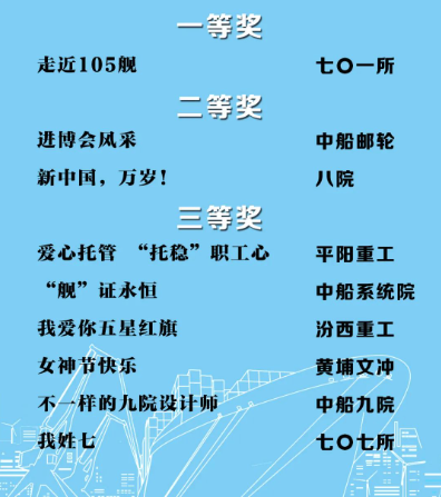 由中國(guó)船舶集團(tuán)黨群工作部指導(dǎo),中國(guó)船舶集團(tuán)新聞宣傳中心/中國(guó)船舶報(bào)社承辦的中國(guó)船舶集團(tuán)第二屆短視頻大賽圓滿落幕。經(jīng)過前期篩選,網(wǎng)絡(luò)投票,并特邀國(guó)務(wù)院國(guó)資委新聞中心、國(guó)防科工局新聞宣傳中心、中央電視臺(tái)、微博政務(wù)、中國(guó)船舶集團(tuán)黨群工作部專家評(píng)審,大賽最終評(píng)出一等獎(jiǎng)5部,二等獎(jiǎng)10部,三等獎(jiǎng)23部,同時(shí)評(píng)出優(yōu)秀組織獎(jiǎng)單位6家。名單如下,快來圍觀!