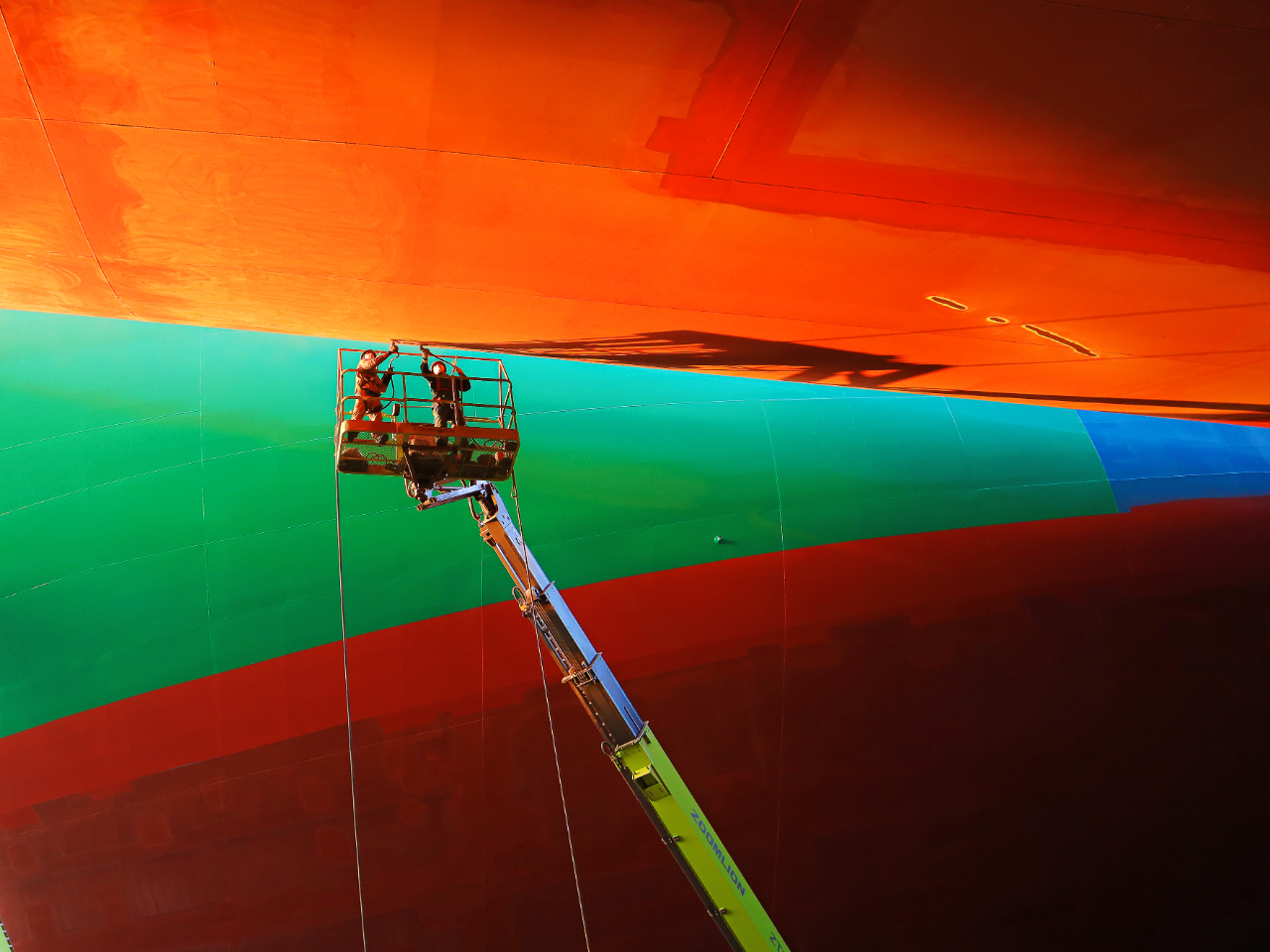 兩位打磨工人駕駛高空車(chē)對(duì)外板進(jìn)行清潔施工,這個(gè)瞬間,他們?nèi)缤蒙碛谕挳?dāng)于一般。