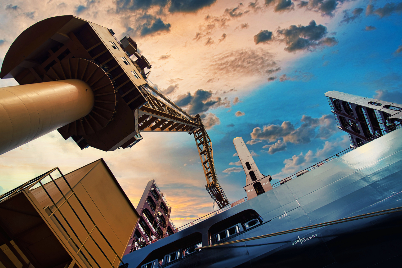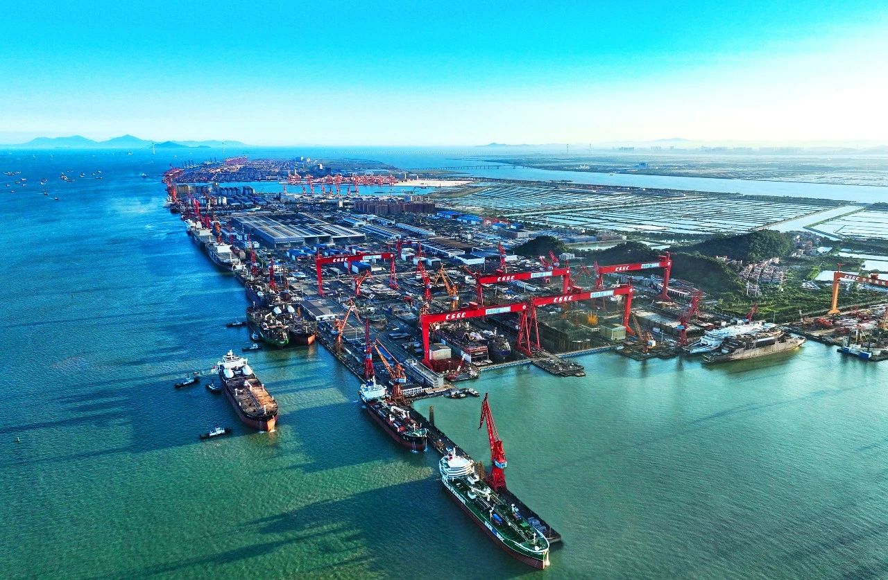 落日余暉下,造船現(xiàn)場(chǎng)燈火通明,展現(xiàn)出一派繁忙景象。在五彩斑斕的晚霞襯托下,整個(gè)造船基地猶如寶石般熠熠生輝。