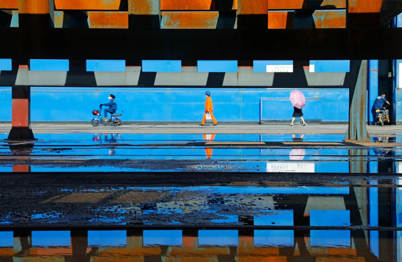 夏日清晨,一場(chǎng)大雨過(guò)后空氣透亮清新,廠區(qū)高跨門(mén)口服裝各異的職工行走在上班的路上,空地上擺放的工裝架與其自身的投影形成了獨(dú)特的畫(huà)框,讓畫(huà)面中行走的職工雖小卻很突出,起重工亮橙色的服裝、撐起的雨傘與明亮的藍(lán)色跨門(mén)形成色彩對(duì)比,使畫(huà)面活潑跳躍,職工們形形色色又從容有序,勾勒出廠區(qū)一隅的美麗風(fēng)景。