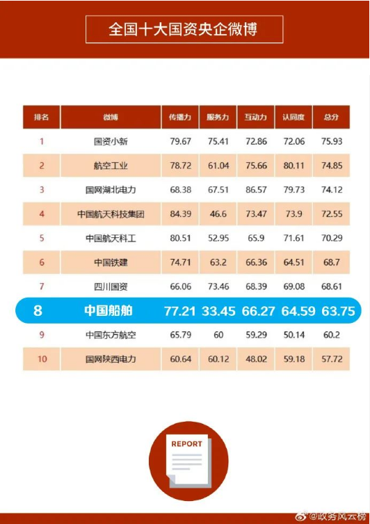 1月31日,由微博出品,人民網(wǎng)輿情數(shù)據(jù)中心、人民網(wǎng)數(shù)據(jù)研究院提供學術支持的“2023年度政務微博影響力報告”發(fā)布?!爸袊啊蔽⒉┑巧稀叭珖髧Y央企微博”榜單,這是“中國船舶”微博第三次進入“全國十大國資央企微博”排行榜。