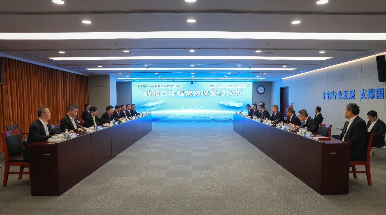 10月15日,中國船舶集團有限公司與中國遠洋海運集團有限公司在上海簽訂戰(zhàn)略合作框架協(xié)議。中國船舶集團黨組書記、董事長溫剛,中遠海運集團黨組書記、董事長萬敏,黨組副書記、總經(jīng)理朱碧新出席簽約儀式。中國船舶集團黨組成員、副總經(jīng)理盛紀綱,紀檢監(jiān)察組組長、黨組成員彭宏,中遠海運集團黨組成員、副總經(jīng)理、總會計師孫云飛出席簽約儀式。盛紀綱和孫云飛分別代表雙方在協(xié)議上簽字。簽約前,雙方就進一步加強溝通交流、深化多領(lǐng)域合作進行了交流探討。