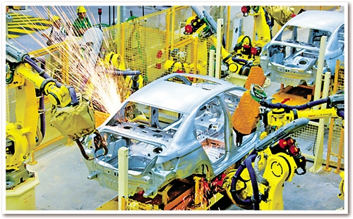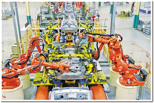 日前,記者在東風(fēng)汽車公司旗下神龍汽車公司成都工廠焊裝車間看到,占地面積約10個(gè)足球場的車間儼然就是一個(gè)“機(jī)器人王國”:442臺(tái)各種機(jī)器人都在忙碌著,所有點(diǎn)焊、弧焊、激光焊、螺柱焊、涂膠、包邊、鉚接、部件搬運(yùn)等“重活、累活”全部由機(jī)器人自動(dòng)完成。焊裝分廠廠長孫繼勝介紹說,除442臺(tái)機(jī)器人外,車間還有另外一個(gè)“撒手锏”??六面體轉(zhuǎn)臺(tái)設(shè)備?!霸瓉砩a(chǎn)1個(gè)車型要建6條生產(chǎn)線,現(xiàn)在1條生產(chǎn)線就可以生產(chǎn)6種車型。”孫繼勝說。