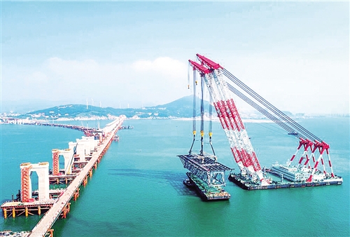8月22日,由中鐵大橋局打造的“大橋海鷗號(hào)”起重船正在吊裝平潭海峽公鐵兩用大橋首孔簡(jiǎn)支鋼桁梁。張 靜攝