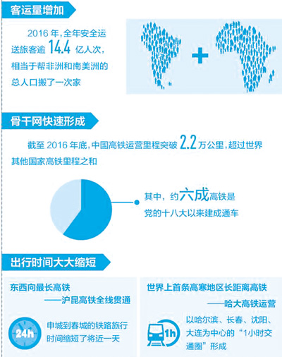 編織一張密度適宜的高鐵網(wǎng)絡(luò),造福盡可能多的民眾。十八大以來,我國高鐵版圖不斷延伸:2013年7月,穿越江南水鄉(xiāng)的寧杭高鐵開通;2014年6月,世界上一次性建成通車里程最長的高速鐵路蘭新高鐵建成通車;2016年12月,滬昆高鐵全線通車,彩云之南不再“邊緣”。截至2016年底,中國高鐵運營里程突破2.2萬公里,超過世界其他國家高鐵里程之和,除幾條線路外,2004年提出的“四縱四橫”高鐵網(wǎng)已全部建成。根據(jù)2016年7月新修訂的國家《中長期鐵路網(wǎng)規(guī)劃》(2016-2030年),預(yù)計到2020年,全國高速鐵路將增加到3萬公里。今年繼續(xù)保持高鐵網(wǎng)絡(luò)快速建設(shè)勢頭,就在上月初,寶蘭高鐵通車,將使千年絲路煥發(fā)更加蓬勃的生機。不久后,我們還將見證張呼客專馳騁于遼闊的大草原,而西成高鐵也將讓千年蜀道不再艱難。