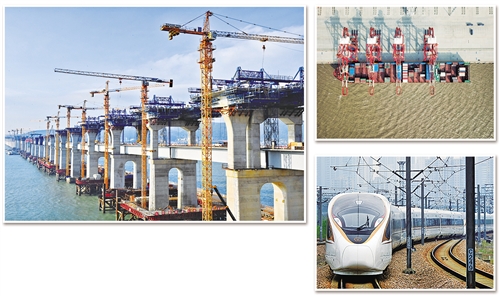 圖① 平潭海峽公鐵兩用大橋是我國第一座公鐵兩用跨海峽大橋。圖為平潭海峽公鐵兩用大橋正在加緊施工。 新華社 張國俊攝