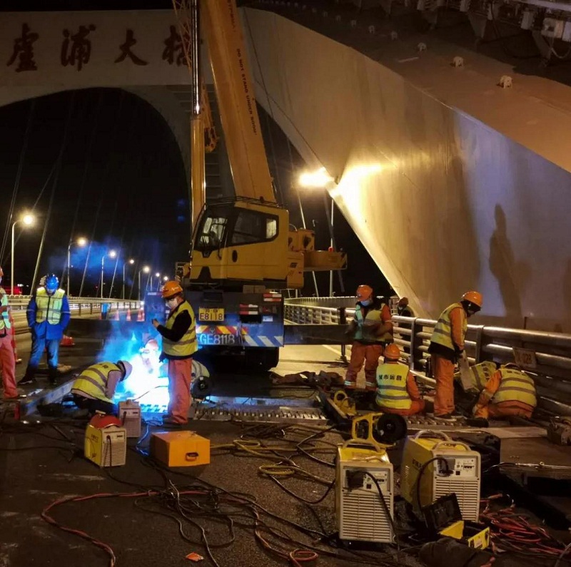 ????此時(shí),來自中國船舶集團(tuán)所屬上海盧浦大橋投資發(fā)展有限公司的守橋人開工了。近20平方米的施工區(qū)域,人頭攢動、焊花飛舞,工人身著的安全背心泛出的熒光,焊槍下閃爍的弧光和橋面的燈光交相輝映。