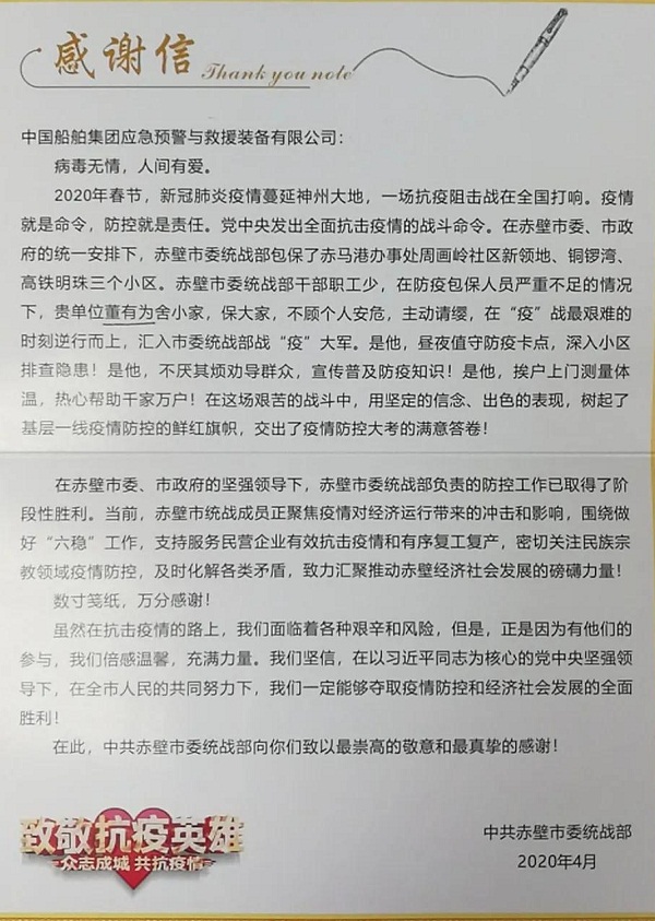????中共赤壁市委統(tǒng)戰(zhàn)部特向中國(guó)船舶集團(tuán)旗下中國(guó)應(yīng)急發(fā)來(lái)感謝信,對(duì)中國(guó)應(yīng)急員工董有為舍小家保大家,不顧個(gè)人安危,主動(dòng)請(qǐng)纓,在戰(zhàn)“疫”最艱難的時(shí)刻逆行而上表示感謝和致敬。