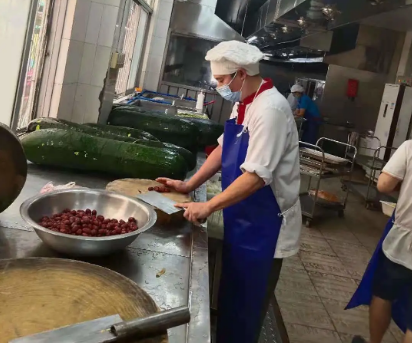 而在技校和養(yǎng)老院的后廚,阮積劍等廚師們同樣已經(jīng)整裝待發(fā)。在社區(qū)封閉初期,飲食服務(wù)部養(yǎng)老院飯?zhí)脝T工由原來的18人劇減至7人。廚師梁志寬面對每日約800人的進餐人數(shù),迎難而上,轉(zhuǎn)變菜式花樣,合理優(yōu)化膳食,注重營養(yǎng)搭配,以嫻熟的廚藝獨自完成后廚大量工作,保證了菜肴準(zhǔn)時出品。而廚師、黨員陳兆銘得知飯?zhí)靡蚴芤咔橛绊懚耸謬?yán)重不足,在試航歸來做完核酸檢測后立即回到養(yǎng)老院飯?zhí)玫膷徫簧稀榇?,他直接把“家”安在了養(yǎng)老院,每天睡在簡易折疊床上。