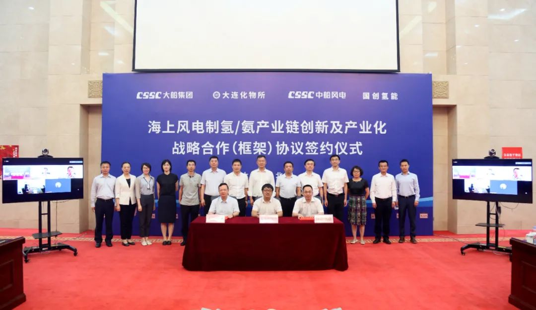 8月6日,中國(guó)船舶集團(tuán)旗下大船集團(tuán)舉行《海上風(fēng)電制氫/氨產(chǎn)業(yè)鏈創(chuàng)新及產(chǎn)業(yè)化戰(zhàn)略合作(框架)協(xié)議》簽約儀式。大船集團(tuán)與大連化物所、國(guó)創(chuàng)氫能、中船風(fēng)電四方代表在協(xié)議書上簽字。