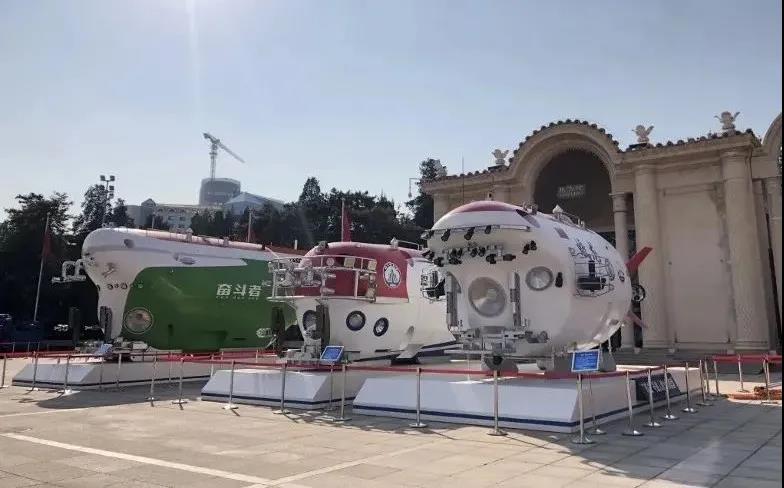屹立展館外場(chǎng)的“蛟龍”號(hào)、“深海勇士”號(hào)、“奮斗者”號(hào)三臺(tái)實(shí)尺度潛水器模型。