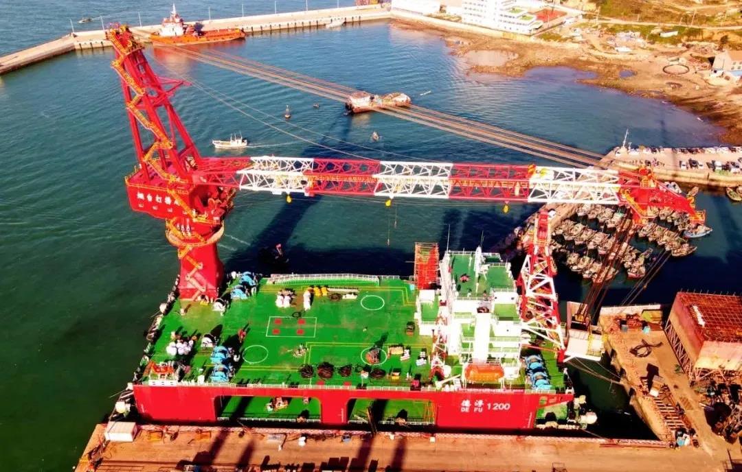 海西重機為“德浮1200”提供最主要的起重設備,起重能力達1200噸,相當可同時吊起800輛小汽車的總重量,全回轉起重能力達1000噸。起重設備將服務“德浮1200”用于近海及淺水水域的風機安裝施工及打撈起重作業(yè)以及無限航區(qū)拖航。