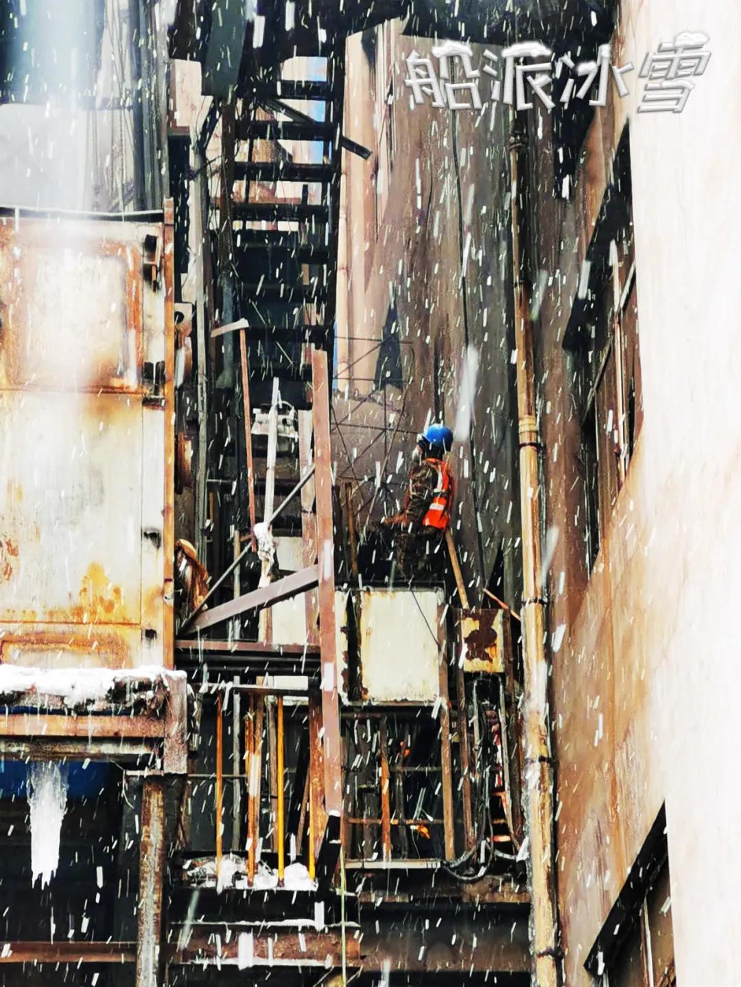 “雪花飄、北風(fēng)蕭,寒梅立雪只為船人香!”撫鋼項目組成員在撫順現(xiàn)場冒雪施工。