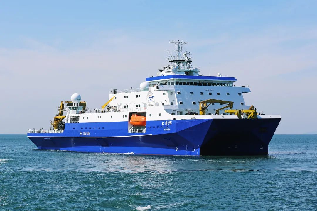 小水線面雙體船是一種水線面積小,且由兩個潛水體和一個水上箱體,中間有兩個流線型支柱連接起來的船舶。該船型耐波性好,能夠很好地解決深海作業(yè)浪大、波峰高等問題,利于在深海開展試驗工作。該船于2019年8月26日開工,2021年3月20日下水,2022年3月23日完工,歷時2年零7個月時間。該船總長99.8米,型寬32米,吃水7.5米,型深13.2米,航速15節(jié),排水量6700噸。