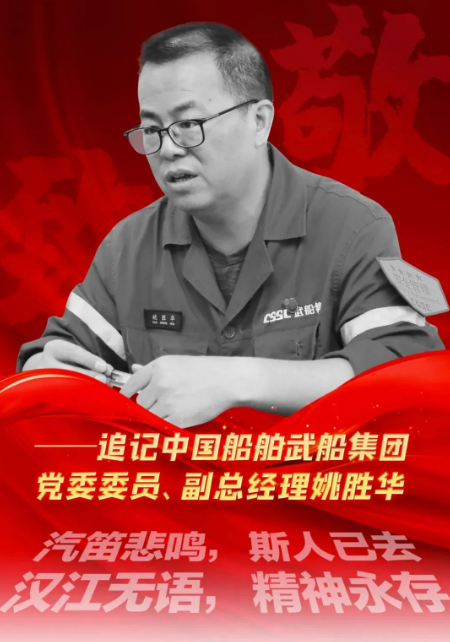 汽笛悲鳴,斯人已去;漢江無語,精神永存。中國(guó)船舶集團(tuán)有限公司旗下武昌船舶重工集團(tuán)有限公司黨委委員、副總經(jīng)理姚勝華,一位沉默、訥言的人,他把自己熬干了、燃盡了,默默地用理想和信念、用忠誠(chéng)和熱血、用苦干與實(shí)干鑄就的,是一座偉大的豐碑!他的精神就像一面高高飄揚(yáng)的旗幟,跨越時(shí)空,熠熠生輝!