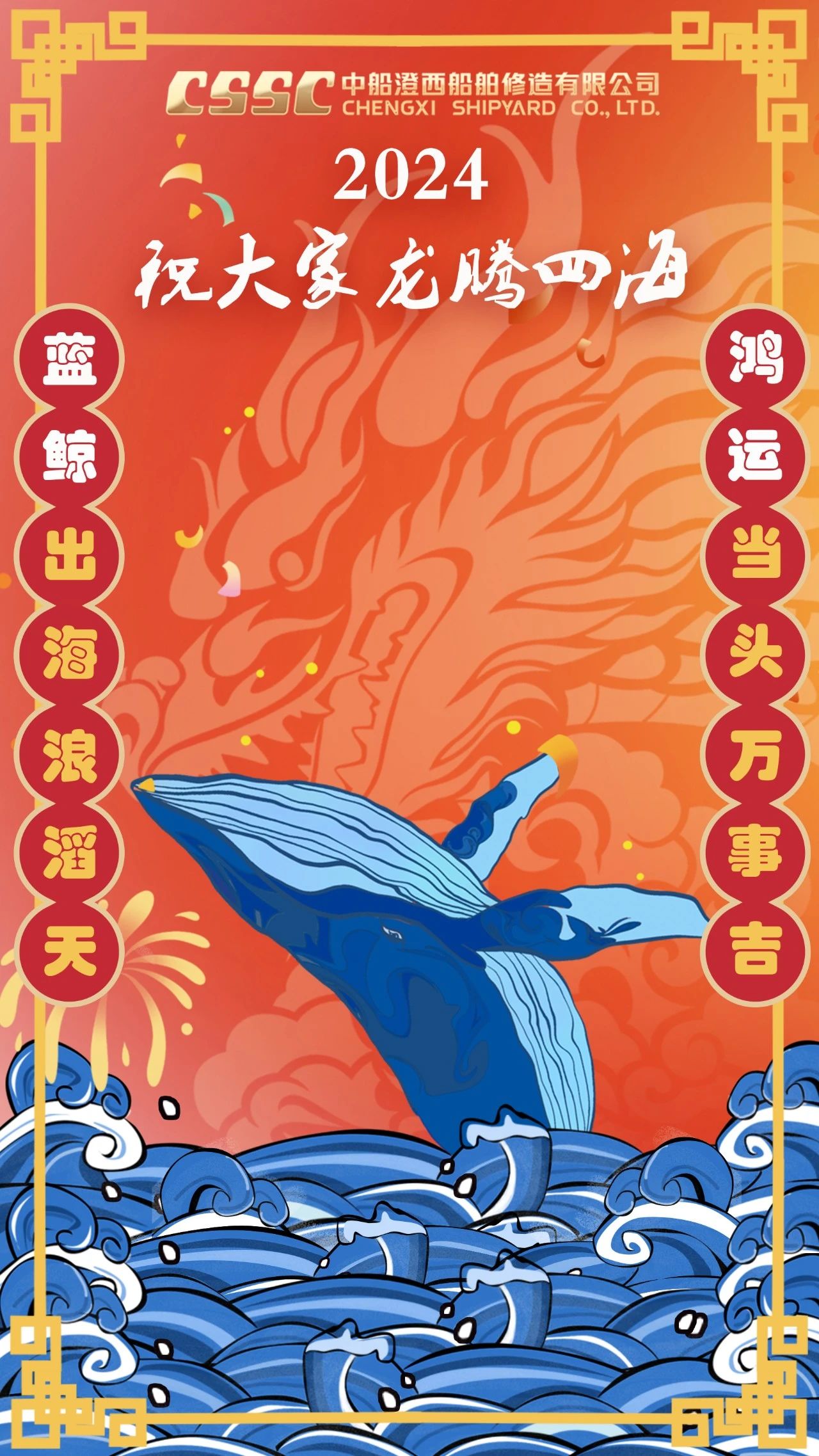 創(chuàng)意說明:海報以龍年為主題,主體為藍鯨。自研8萬噸級散貨船“藍鯨”系列和5萬噸級油化船“鴻運”系列是中船澄西命名的品牌船型,凝結(jié)了公司全員智慧。