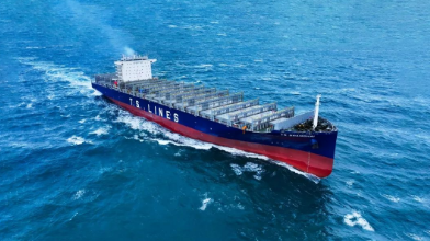 3月26日,中國船舶集團旗下外高橋造船聯(lián)合中船貿(mào)易為TS Lines建造的7000TEU中型集裝箱船“德翔上?!碧柮桓?,一季度完成年度交船計劃的32%。