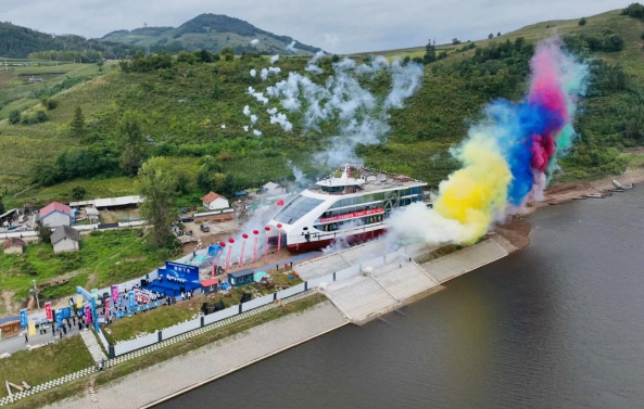 日前,中國(guó)船舶集團(tuán)七一二所提供整船動(dòng)力系統(tǒng)的新能源游覽船“天河一號(hào)”,在吉林省靖宇縣順利下水。“天河一號(hào)”下水現(xiàn)場(chǎng)。該船總長(zhǎng)58米,定員乘客600人,搭載七一二所柴油發(fā)電機(jī)組。在經(jīng)濟(jì)航速下,純電續(xù)航能力超過(guò)4個(gè)小時(shí)。