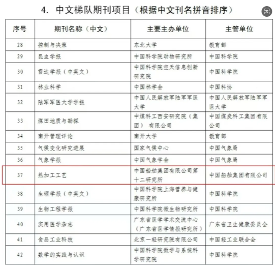 近日,中國科技期刊卓越行動計劃二期(2024—2028年)入選結(jié)果公布,由中國船舶集團有限公司主管、中國船舶集團第十二研究所和中國造船工程學(xué)會聯(lián)合主辦的《熱加工工藝》期刊,成功入選“中文梯隊期刊”項目。這也是中國船舶集團唯一成功入選卓越行動計劃二期的期刊。