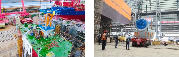 “夢(mèng)想”號(hào)配備的7臺(tái)推進(jìn)器中,3臺(tái)全回轉(zhuǎn)伸縮推是黃埔文沖迄今總成過(guò)的最大伸縮推,并且建造過(guò)程中伸縮推需要進(jìn)行全程升降試驗(yàn),升降高度差達(dá)4.3米。完成試驗(yàn)的伸縮推總段重量超過(guò)了船廠龍門吊最高900噸的起重能力?!皦?mèng)想”號(hào)工藝負(fù)責(zé)人馮仕清創(chuàng)新性地提出了采用龍門吊和履帶吊聯(lián)合吊裝的方法,最終保證了伸縮推的成功安裝。