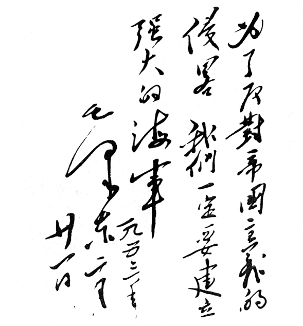 1953年2月19日,毛澤東在武漢登上長江艦視察長江中下游四省,并在長江艦上為海軍題詞:“為了反對帝國主義的侵略,我們一定要建立強大的海軍。”船未行至南京,毛澤東提出要在南京檢閱海軍戰(zhàn)艦。華東海軍立即抽調(diào)了“廣州”號和“南昌”號護衛(wèi)艦、“黃河”號登陸艦,以及101號、104號魚雷艇參加檢閱。幾天中,毛澤東連續(xù)5次都寫下同樣的題詞:“為了反對帝國主義的侵略,我們一定要建立強大的海軍”。這是中國領(lǐng)導人對建設(shè)強大海軍、建設(shè)一流裝備的殷切期望,是新生的中國對建設(shè)強大海防的決心。如今這顆刻著偉人囑托的銘石,靜靜矗立在江南造船長興島造船基地行政樓前的草坪,也靜靜地矗立在每一位江南人的心中。