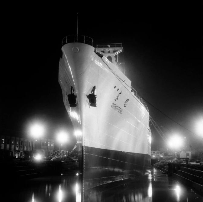 “一五”后期,研制萬噸級遠洋貨船被列為國家新科技規(guī)劃的重點項目。在西方長期封鎖尤其是后來蘇聯(lián)中止援助的困難局勢下,“東風”號是中國人首次嘗試自行設(shè)計、自行建造,全部采用國產(chǎn)設(shè)備的首艘萬噸遠洋船。1960年4月15日,“東風”號下水,時任上海市委書記陳丕顯、副市長曹荻秋等人出席下水典禮。萬噸輪被命名為“東風”號。