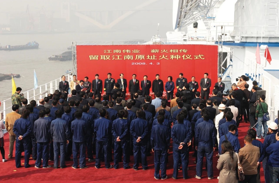 2008年4月,江南造船老廠建造的最后一艘船“遠望6”號航天測量船即將交付。4月3日,時任江南造船搭載部部長黃文飛作為取火者從“遠望6”號船前甲板的上建位置手拿焊槍取火引燃火炬。火炬依次傳遞至勞動模范、三八紅旗手、江南造船領(lǐng)導等,最后傳至時任中船集團總經(jīng)理陳小津手中并由他點燃了火種盒。6月3日,江南造船人親手建造的船舶特地趕回“娘家”,載著江南“火種”駛往新基地,為新建造的產(chǎn)品開工點火。