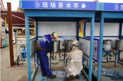 江南造船為一線員工送棒冰、鹽汽水、酸梅湯、水壺等物資,食堂開設(shè)綠豆湯專供窗口,生產(chǎn)區(qū)域設(shè)置115個大麥茶供應(yīng)點(diǎn),遍布各車間、碼頭、休息區(qū);提前策劃,按就近、共享以及區(qū)域化管理原則,新增職工小家,開放辦公樓宇和食堂,設(shè)置高溫休息點(diǎn)。