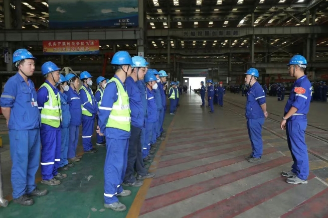 武昌造船、中船澄西、中船物資、中船動(dòng)力和汾西重工等單位按照“五步法”召開(kāi)班前會(huì),確認(rèn)人員狀態(tài)及勞保防護(hù)裝備;分享安全案例,剖析隱患;細(xì)化工作任務(wù),標(biāo)注風(fēng)險(xiǎn),明確應(yīng)急流程;隨機(jī)抽查復(fù)述,組員互查要點(diǎn);全員齊喊安全或精益口號(hào),提振士氣。