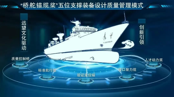 基于“全自主研發(fā)”和“巨系統(tǒng)抓總”的問題導(dǎo)向,七〇八所“遠(yuǎn)望”研發(fā)創(chuàng)新團隊凝聚智慧和力量,以創(chuàng)新為引領(lǐng)、以遠(yuǎn)望文化為驅(qū)動,提煉了“橋、舵、錨、纜、槳”五位支撐裝備設(shè)計質(zhì)量管理模式。各項核心管理要素相互作用、五位支撐裝備研發(fā)設(shè)計過程,構(gòu)建形成了一個良好向上、持續(xù)提升的團隊質(zhì)量管理機制,為確保裝備研制質(zhì)量奠定了堅實基礎(chǔ)。“橋”是“艦橋”的簡稱,是艦船駕駛控制、觀察及決策的主要設(shè)施,其作用如同質(zhì)量控制?!岸妗笔强刂婆灤叫蟹较虻闹饕O(shè)備,其作用如同規(guī)范指引?!板^”作為艦船停泊和定位的主要設(shè)備,其作用如同試驗驗證。“纜”作為艦船靠幫連接的主要設(shè)備,其作用如同接口管理。“槳”是提供艦船航行動力的主要設(shè)備,其作用如同人才保障。