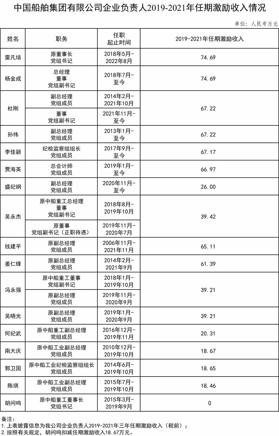 中國(guó)船舶集團(tuán)有限公司企業(yè)負(fù)責(zé)人2019-2021年任期激勵(lì)收入情況