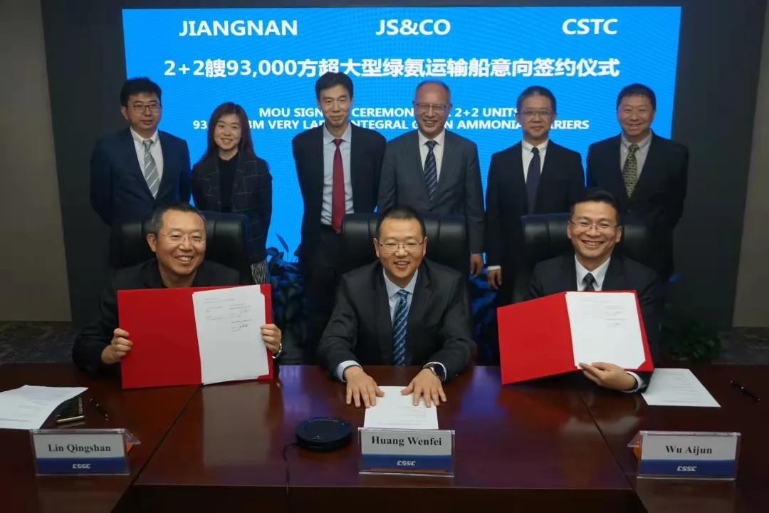 12月10日,中國船舶集團旗下江南造船攜手貿(mào)易公司與JS & Co視頻簽署了2+2艘93000立方米超大型綠氨運輸船(VLAC)合作備忘錄。