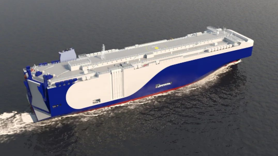 該船型由中國船舶集團(tuán)旗下上海船院設(shè)計(jì),總長200米,型寬38米,裝載能力9000車,可運(yùn)輸電動車和常規(guī)燃料汽車以及其他類型的重型滾裝貨物。