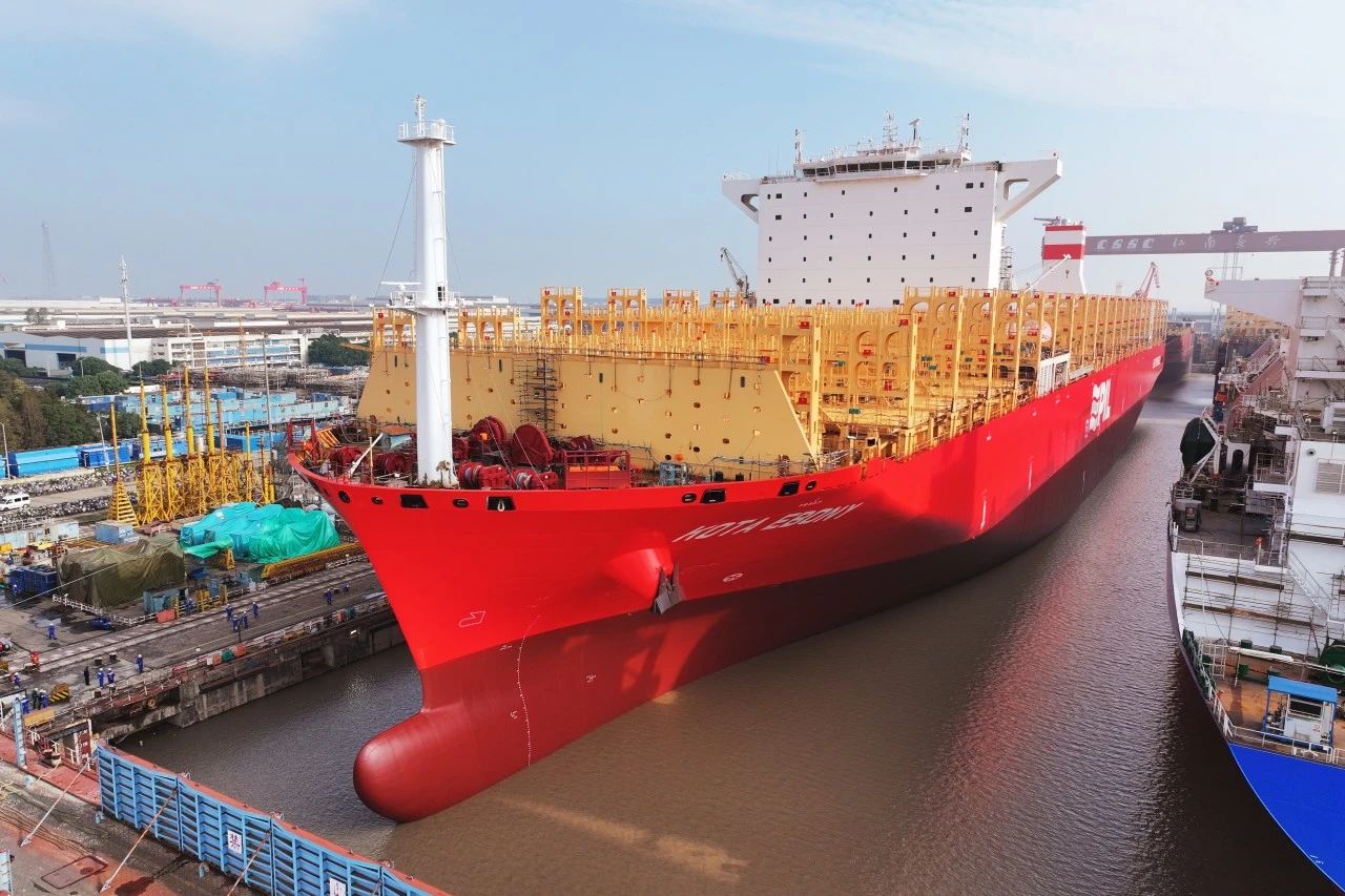 同步起浮的2艘半船是為新加坡太平船務(wù)(PIL)建造的14000TEU LNG雙燃料集裝箱船系列船第四艘的艏、艉半船。為了更好地進行船舶浮態(tài)對中,減少變形量,建造團隊開創(chuàng)了新的起浮方案,為后續(xù)集裝箱船樹立了半船起浮的新模式。