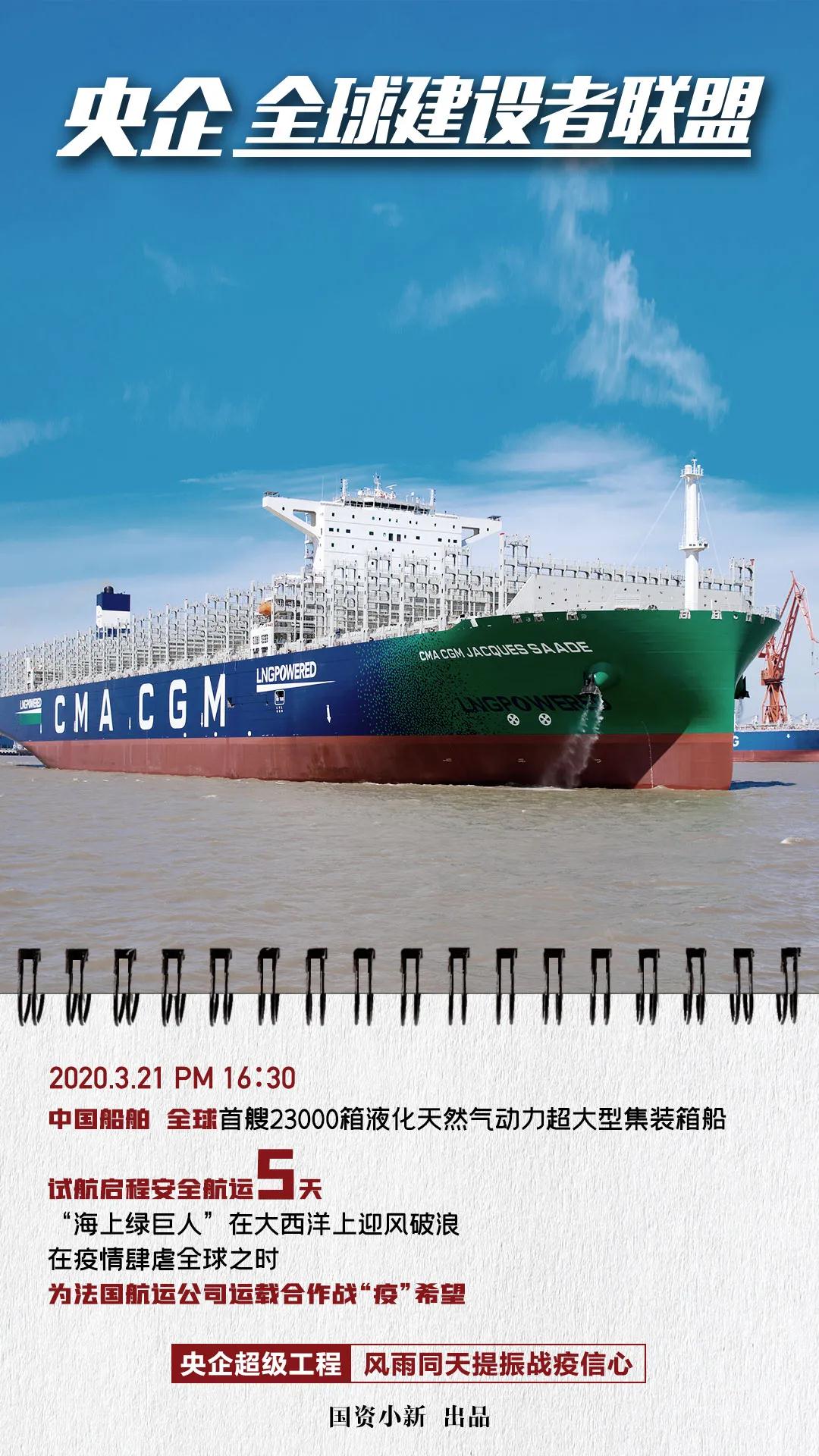 ????今天,國資小新發(fā)布圖文消息《央企全球建設(shè)者聯(lián)盟:風(fēng)雨同天提振國際合作戰(zhàn)疫信心!》。開篇提到中國船舶集團(tuán)所屬滬東中華建造的全球首艘23000箱液化天然氣(LNG)動力集裝箱船開啟常規(guī)試航之旅,在疫情肆虐全球之時(shí),為法國航運(yùn)公司運(yùn)載合作戰(zhàn)“疫”希望。