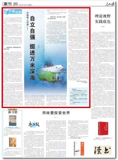3月2日,人民日?qǐng)?bào) “開卷知新” 專欄刊發(fā)“蛟龍?zhí)枴笨傇O(shè)計(jì)師中國(guó)工程院院士中國(guó)船舶集團(tuán)七〇二所研究員徐芑南文章《中國(guó)載人深潛——自立自強(qiáng) 挺進(jìn)萬(wàn)米深海》。