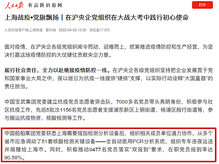 “中國(guó)船舶集團(tuán)黨組獲悉上海需要增加檢測(cè)分析設(shè)備后,組織相關(guān)成員單位通力協(xié)作,從多個(gè)省市應(yīng)急調(diào)動(dòng)了51套核酸檢測(cè)關(guān)鍵設(shè)備——全自動(dòng)醫(yī)用PCR分析系統(tǒng),組織專車連夜運(yùn)送并捐贈(zèng)給上海市。同時(shí),積極推動(dòng)9477名黨員落實(shí)‘雙報(bào)到’要求,在職黨員報(bào)到率達(dá)90.58%。”