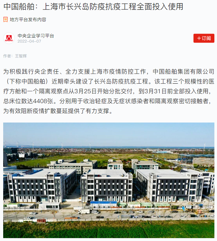 中國(guó)船舶:上海市長(zhǎng)興島防疫抗疫工程全面投入使用