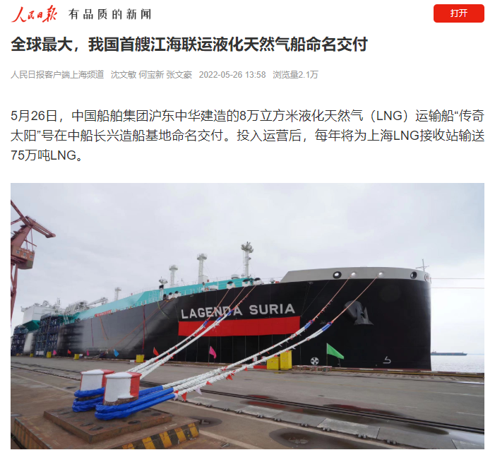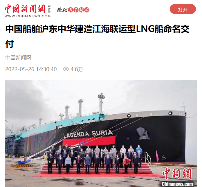 5月26日,中國船舶集團(tuán)旗下滬東中華聯(lián)合中船貿(mào)易建造的8萬立方米液化天然氣(LNG)運(yùn)輸船“傳奇太陽”號在長興造船基地命名交付?!皞髌嫣枴碧柺侨蜃畲鬁\水航道第四代、我國首款首制首艘江海聯(lián)運(yùn)型LNG船,填補(bǔ)了中國淺水航道LNG船的空白,在該細(xì)分市場占有率最高,有望成為中國船舶制造的又一精品船型。