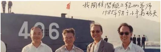 ▲黃旭華(右一)在“406”號彈道導(dǎo)彈核潛艇前的留影