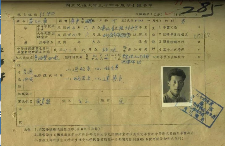 “國立交通大學(xué)”這所當(dāng)時在科學(xué)技術(shù)領(lǐng)域全國首屈一指的學(xué)術(shù)殿堂,在黃旭華心中是神圣而遙遠(yuǎn)的。以至于當(dāng)真正有機會填寫被保送大學(xué)的名字時,他竟然沒有勇氣填上“國立交通大學(xué)”的名字,只填上了一個中央大學(xué)的航空系。