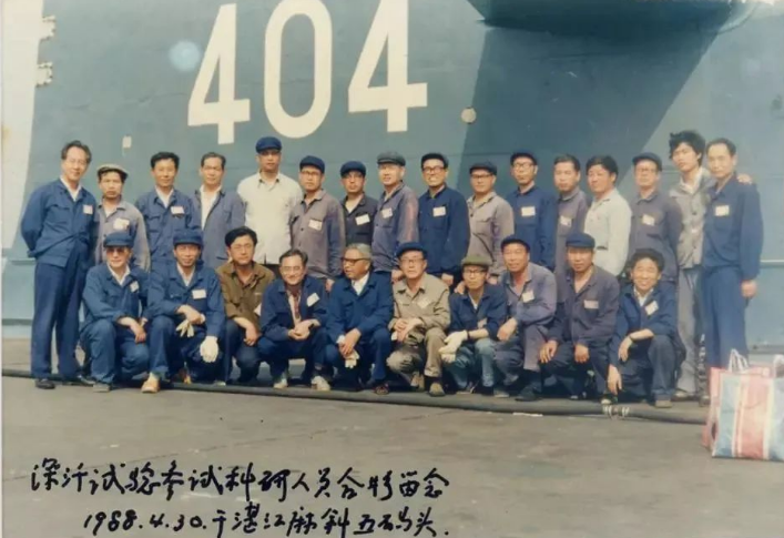 ▲黃旭華(后排左一)同參與深潛試驗的科研人員合影(1988年4月30日攝)