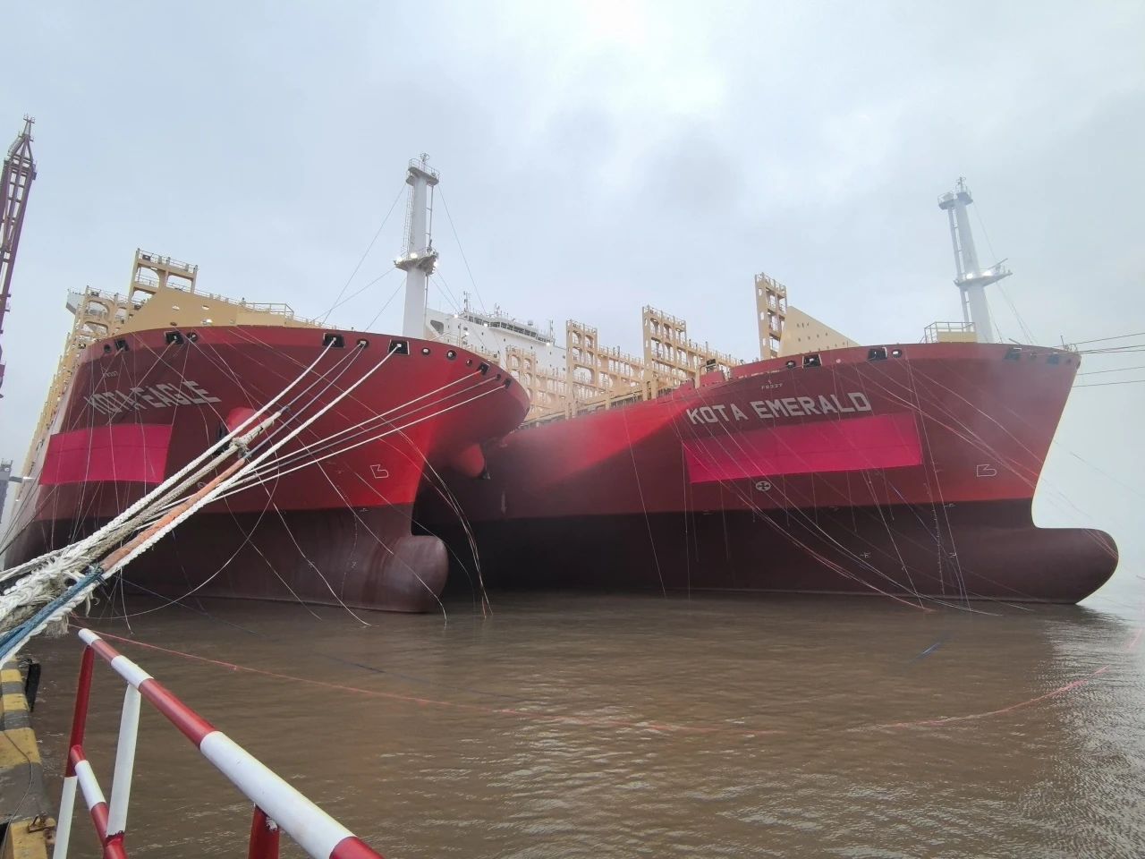 10月15日,中國船舶集團(tuán)旗下江南造船聯(lián)合中船貿(mào)易為太平船務(wù)建造的14000TEU液化天然氣(LNG)雙燃料動(dòng)力系列集裝箱船首制船“KOTA EAGLE(鷹城)”號(hào)和2號(hào)船“KOTA EMERALD(翠城)”號(hào)同日命名,其中“KOTA EAGLE(鷹城)”號(hào)于當(dāng)日簽字交付。