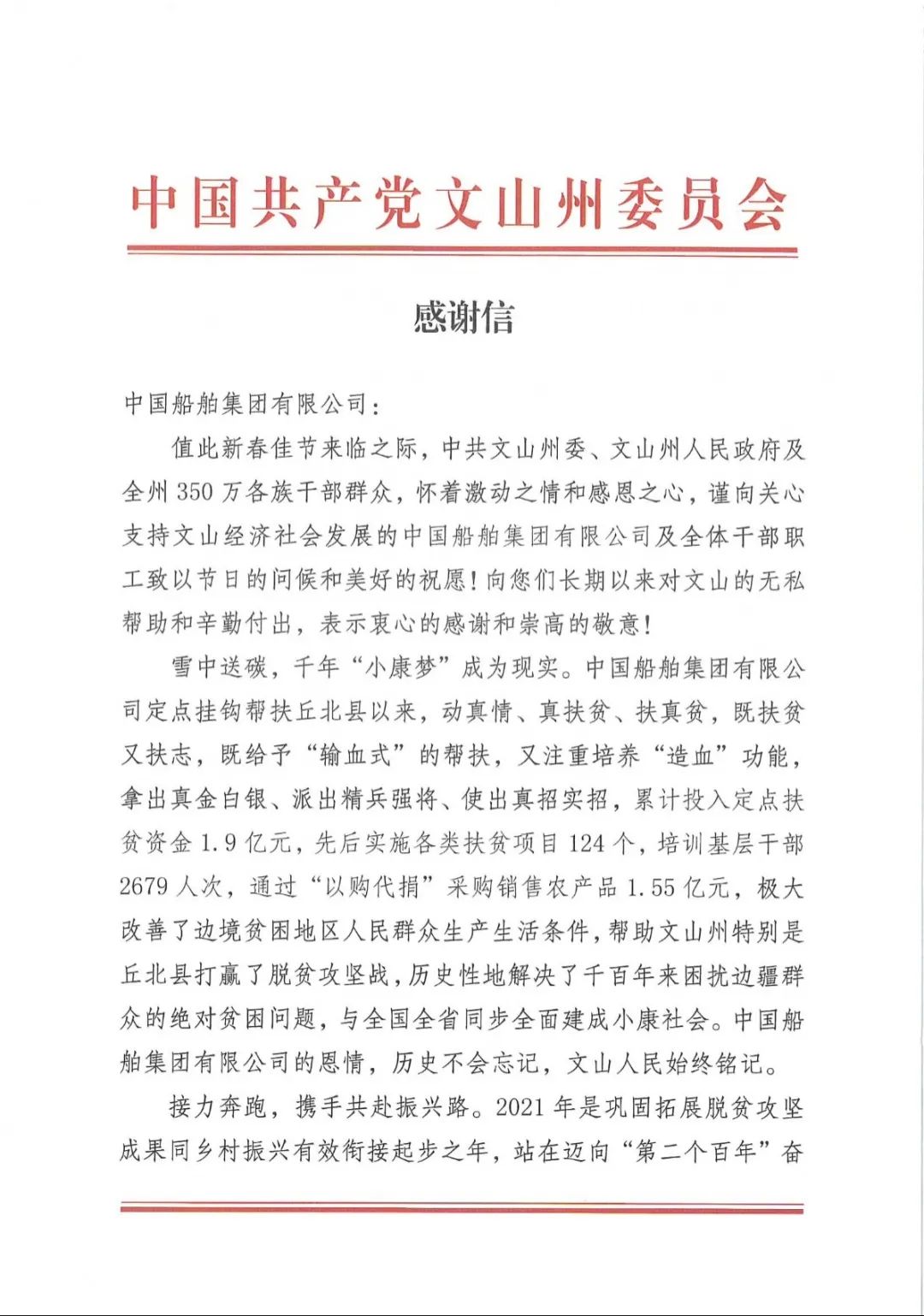 春節(jié)前夕,中國(guó)船舶集團(tuán)陸續(xù)收到云南省委省政府、文山州委州政府、鶴慶縣委縣政府、勐臘縣政府發(fā)來(lái)的感謝信,對(duì)集團(tuán)公司長(zhǎng)期以來(lái)給予鶴慶縣、勐臘縣、丘北縣的傾力幫扶表示衷心感謝和崇高敬意。